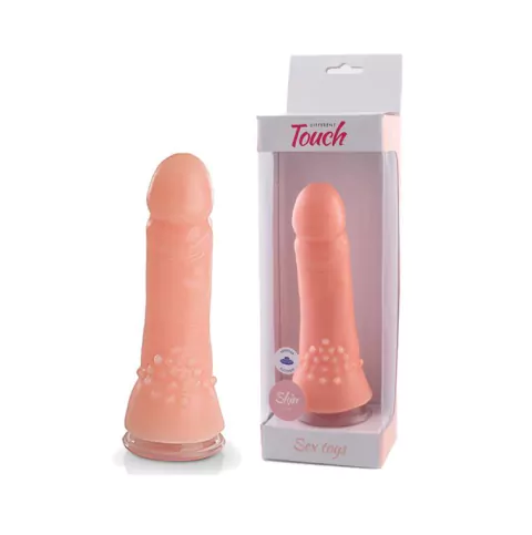 Juguete de diseño recto, flexible, glande pronunciado, superficie suave y con mini protuberancias para la estimulación de clítoris, posee ventosa en su base para que puedas fijarlo y utilizarlo con total libertad, compatible con arnés.